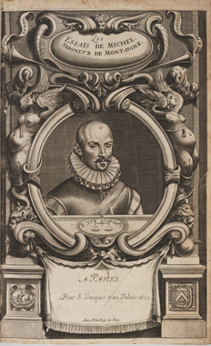 Frontispiece portrait of Montaigne from the 1652 edition of the Essais owned by Jean-Jacques Rousseau, with Montaigne’s motto Que scay-je? and a pair of evenly balanced scales. From the Montaigne Library. [This image not on display]
