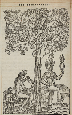 Nuts from the ahouai tree used to make leg rattles by the Tupinamba, from André Thevet, Les singularitez de la France antarctique, autrement nommée Amérique (Paris, 1558). From the Montaigne Library. [This image not on display]